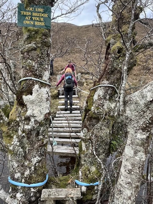A recent post in Walkhighlands from a dog walker had given us pause for thought. Clearly the dogs would not be able to cross the bridge - a shaky construction of rope and wooden slats with one or two slats missing for good measure. So dogs and owners headed upstream to find a crossing spot. In the event, the shoogly bridge lived up to its name, but the crossing was fine and even provided some modest bridge training for one of our number who was heading to Pakistan trekking later this summer.