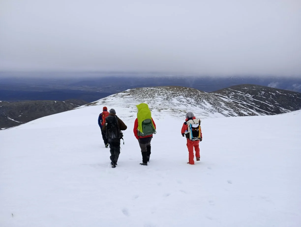 Close to the summit rime-coated rocks revealed some more features, and the summit was crowned in ice and a cold breeze. Descending North, for one timed-kilometre, we dropped out of the cloud into a hollow, with views opening up towards Briariach. A few attempts at glissading on the descent were unsuccessful, and before long the snow was too patchy. The tops of Meall Bhuidhe and Gael Charn were briefly rained upon, before a steep descent back to the woodland and cars. A surprisingly good day out, given the prior forecast, was had by all.