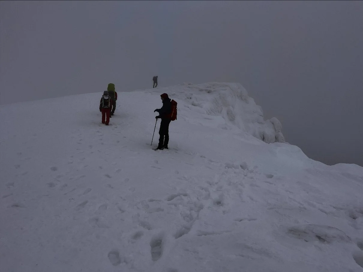 We had opted to make an anticlockwise circuit, if the weather allowed, traversing the NW ridge after the summit. A recent thaw took away most of the risk of avalanche, but care to read the conditions was still required from 600m upwards. Above 800m we entered a white-walled box, where footprints led the eye and it was easier to rely on electronic navigation tools unless you were keen. Martin practiced handrailing the East and West edges of the summit plateau, well away from any cornices, unsuccessfully trying to walk on top of the snow!
