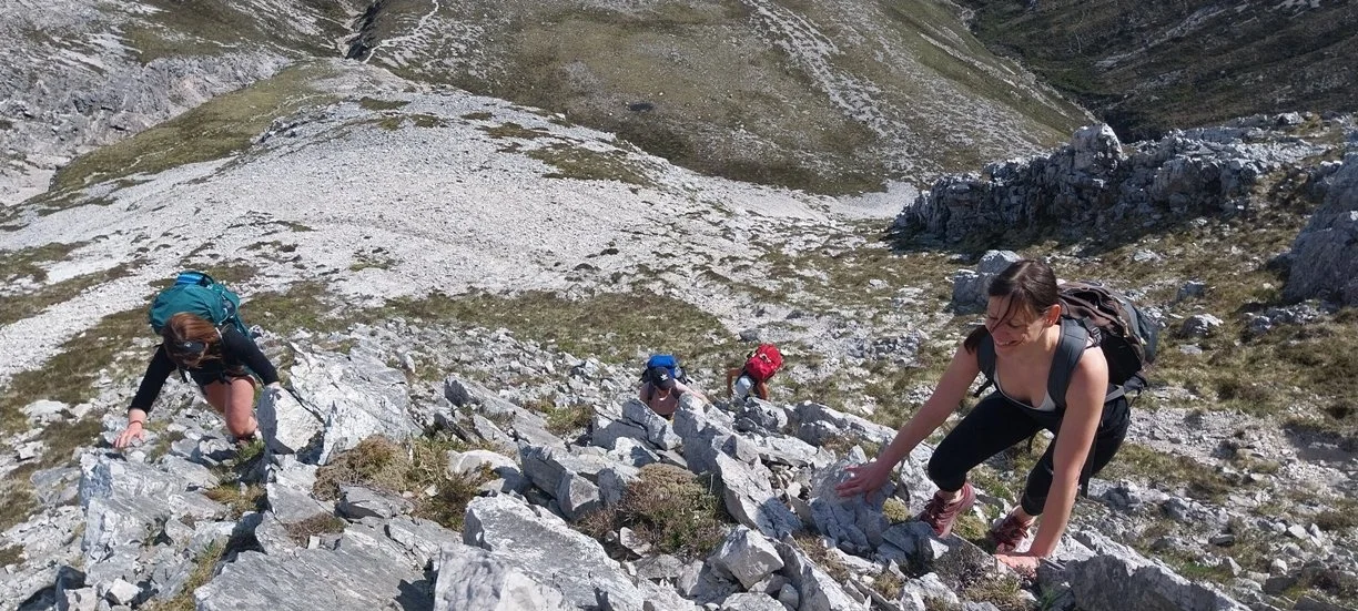 The motivation was there, and six happy ladies (Stela, Mairi, Gill, Juliette, Karina and Henri) and Mr Martyn set off for the adventure. A short and sweet scramble compared to our usual 20km walks! Two cars were left at the end of the route to make it easier, saving the tedious road walk. After the route was discussed, we left in great spirits. It was a nice and easy start along paths, the team managed to cross the only burn safely, scrambling out of the gully up after filling the bottles with water. The sun was shining with blue skies and a short break followed up with some good conversation.