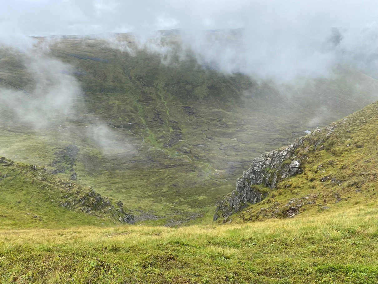 Shortly afterwards we negotiated a rickety bridge and the track turned into a boggy bealach. Traversing a wide bog-tussock-burn hillside by the most efficient route nevertheless disturbed the midges as we stopped to don waterproofs, and later to remove them. A group of four behind us appeared to follow the winding ATV tracks and probably walked several kilometres more! A grassy ramp, with wild flowers, took us to within 300m of the cloud-covered summit that we’d glimpsed a few times on the walk in.