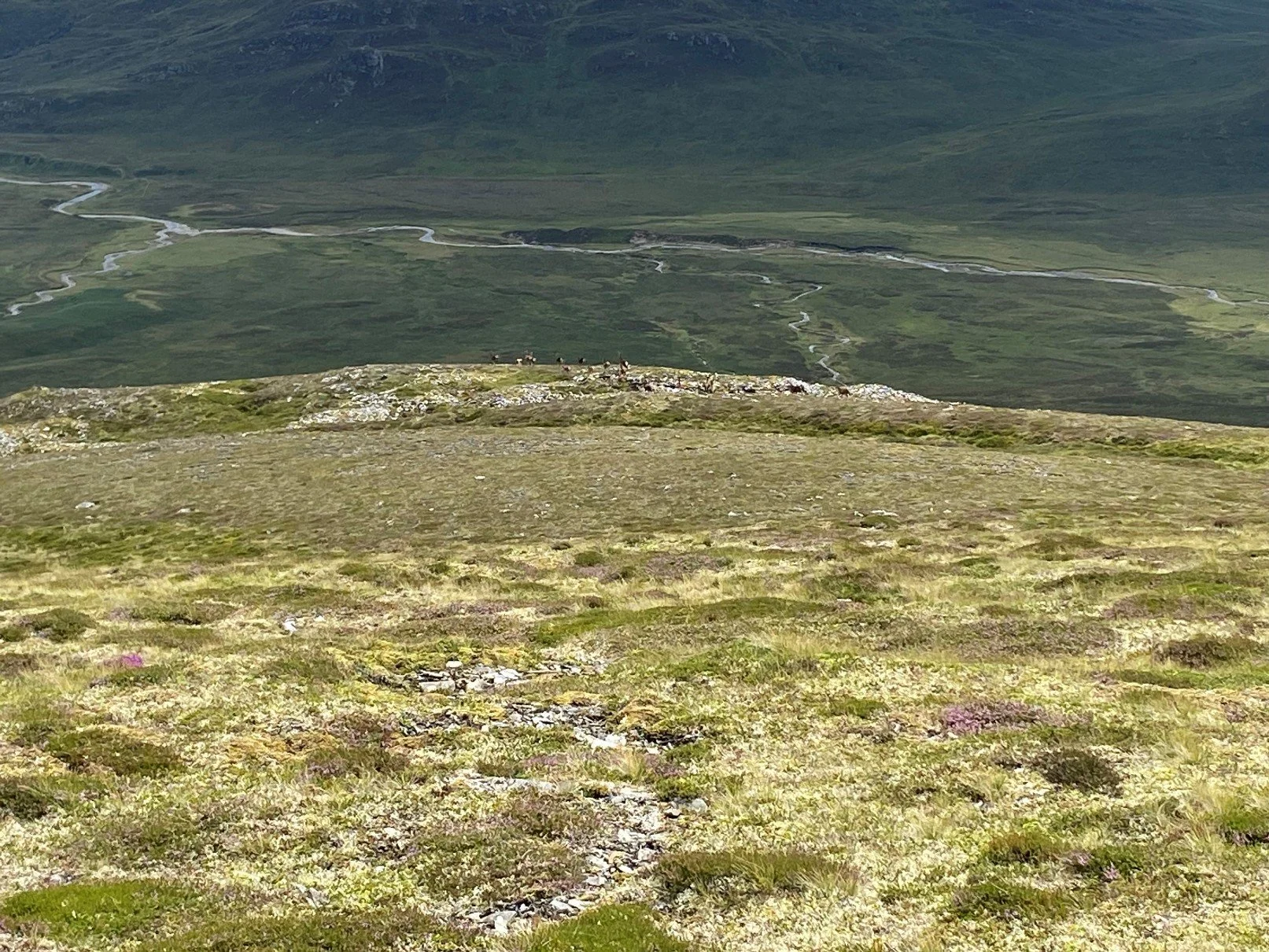 Following lunch, and a decision to stick together for a southern return loop, the cloud lifted and we were treated to views around the Monadhliadh and across to the Drumochter Hills. Descending over Carn Macoul we surprised 20-head of Red Deer (can you spot them?) because the wind was in our favour. There were also plenty of wild flowers including Harebell and Bog Asphodel to complement the shades of heather (ling, bell, and the decline of the cross-leafed heath). The steep descent through Bog Myrtle took us to the Allt an Lochain Duibh and the River Calder for a steady pace back to the cars in sunshine. May’s conviction of always taking sunglasses certainly paid off.