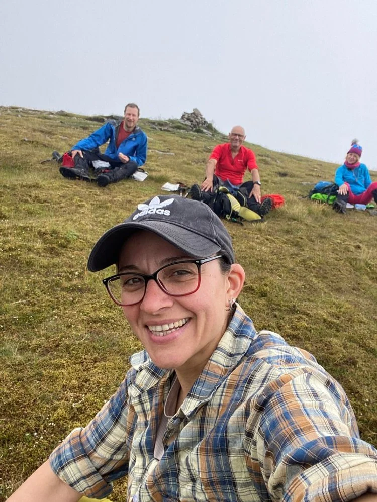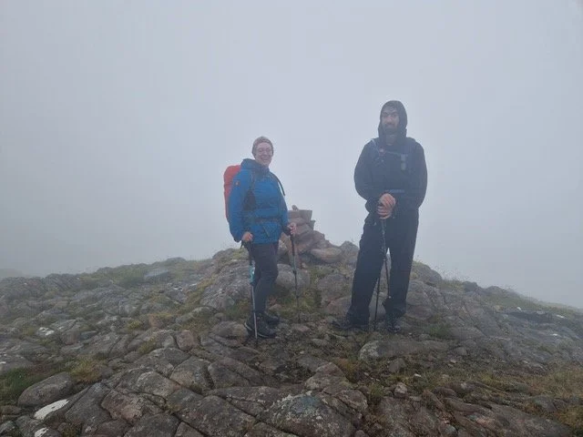 Arthur and Mel were unsure about going out in the rainy forecast but Daniel was keen to get out so they made their way across to Torridon with the skies brightening slowly as they travelled west (unusually!). The carpark at the Torridon hotel was surprisingly midge free and was a good place to start winding up the path through the trees. The views towards Ben Damh opened up although only to a height of about 600m. Soon after crossing the river, pathless open hillside was climbed to get to the top. There is a cairn on a false summit, in the clag causing a little bit of confusion, but soldiering on they finally found the true summit.