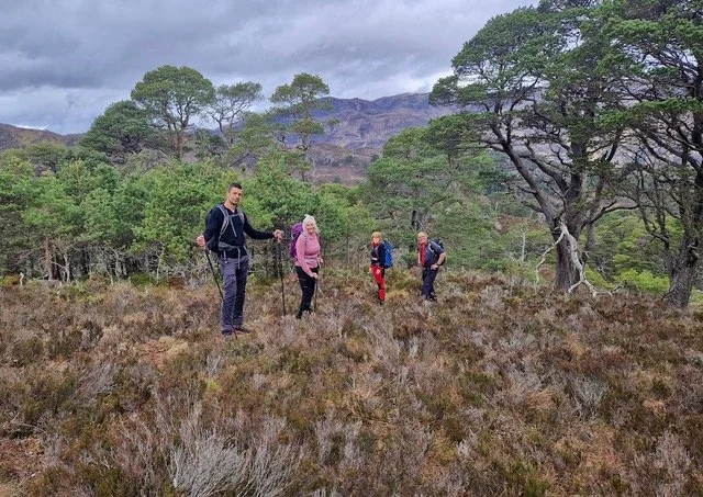 Diana, May, Lukasz, Arthur and Martyn met at the carpark for Glen Strathfarrar and then teamed up to take a car up the Glen about 7km to Pollcherian Bridge. The route started across the River Farrar and made its way through Pine, Alder and Birch Forest out on to the open moorland above the Glen. The forest here is a good example of how a lot of Highland glens would have once looked.