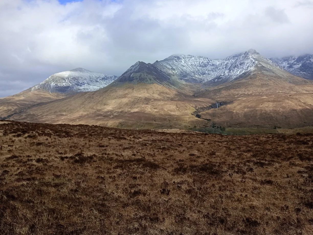Hugh’s and Ewen had left Glen together, but with separate goals. Ewen drove around to Ben Tianavaig on the East Coast. Hugh got dropped above the Fairy Pools carpark and traversed the west side of the Glen, battling into the wind all day. At one point he had to crawl to reach the summit of Beinn a’ Bhraghad, before continuing over Beinn Staic, An Cruachan and Truagh Mheall to reach the footbridge in Glenbrittle.