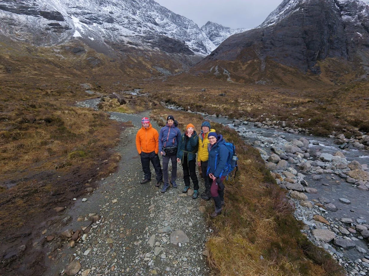 Meanwhile Martyn, Stela, Agnes, and Ged decided to give it a go and head to Coire a’ Ghrunnda, however the very strong winds and heavy rain caused a retreat to the café at the Glen Brittle Campsite for hot drinks. The afternoon saw better weather and a walk to the Fairy Pools and the beyond into Coire na Creiche.